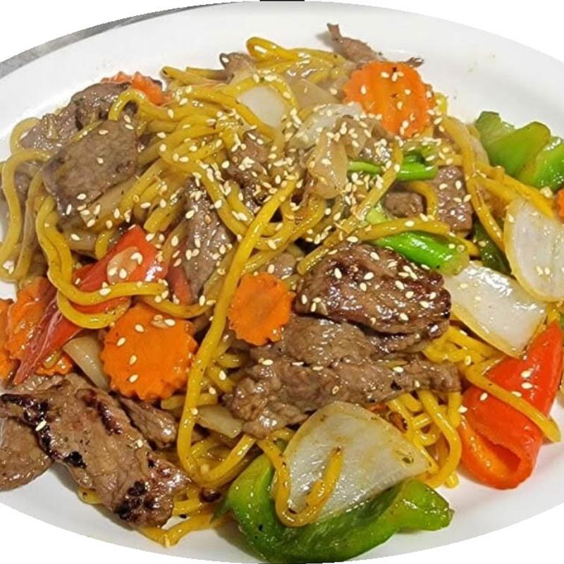 Stir fried Yakisoba noodle with broccoli, carrots, red & green bell peppers, white onion, chili paste, and soy sauce. Topped with sesame seeds.